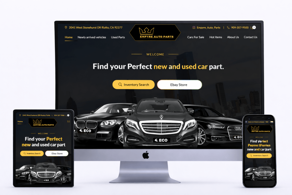 We designed and developed a functional online platform for Empyre Auto Parts, a family-owned automotive wrecking yard in Rialto, CA specializing in quality used parts for European and exotic vehicles. The site features an intuitive parts search and categorized inventory, smooth navigation to newly arrived vehicles and used parts, and clear contact information that helps users quickly find what they need. With responsive design and easy browsing on any device, visitors can explore available components, view vehicle listings, and connect with the team. Our work enhances Empyre Auto Parts’ digital presence and makes sourcing hard-to-find auto parts more accessible for customers.