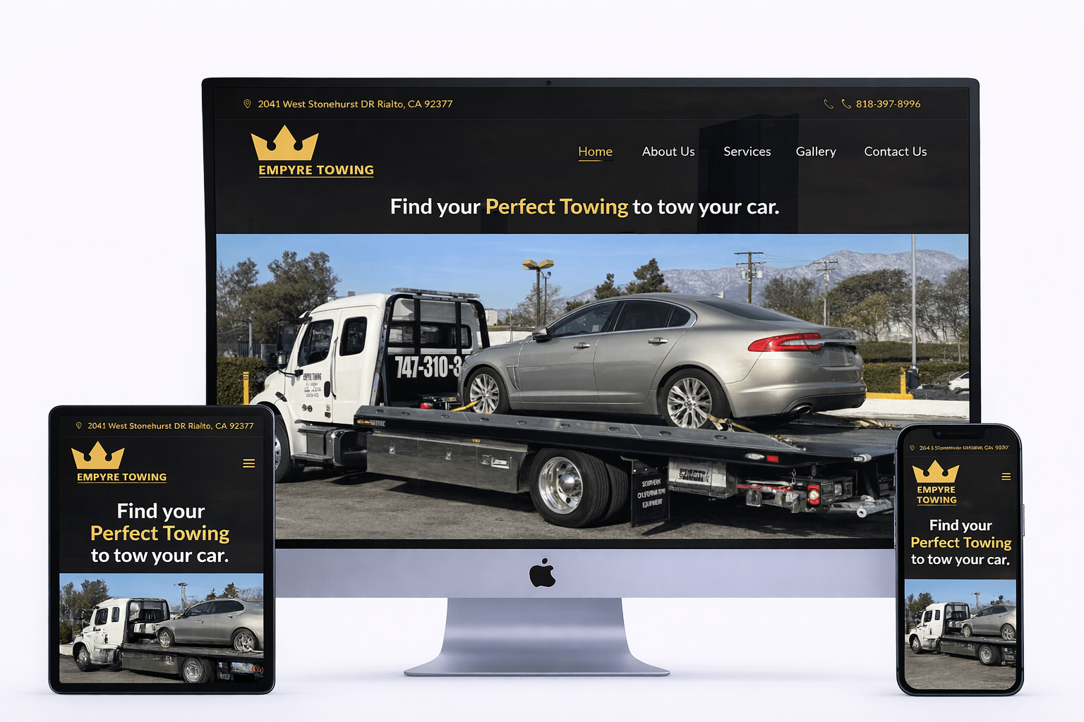 We built a responsive and professional service website for Empyre Towing, a trusted roadside-assistance and towing provider based in Rialto, CA. The site highlights their full range of services—including motorcycle, flatbed, and vehicle towing, tire puncture and repair support, and specialized EV battery and electric vehicle assistance—with intuitive navigation and clear service pages. Designed for fast information access on any device, the platform helps users quickly find the help they need and contact the team 24/7. Our work enhances Empyre Towing’s online presence, improves user engagement, and communicates reliability and readiness for emergency situations.